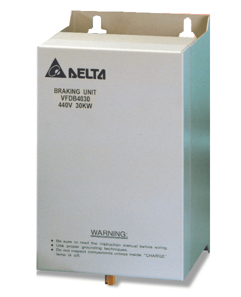 Delta: Brake Unit VFDB4030 Brake Unit 30kW 460 V DELTA’s VFDB braking units are applied to absorb the motor regeneration energy when the three-phase induction motor stops by deceleration. With VFDB braking unit, the regeneration energy will be dissipated in dedicated braking resistors. To prevent mechanical or human injury, please refer to this instruction sheet before wiring. VFDB braking units are suitable for DELTA AC Motor Drives VFD Series 460V. VFDB braking units need to be used in conjunction with BR series braking resistors to provide the optimum braking characteristics. Model No. VFDB4030